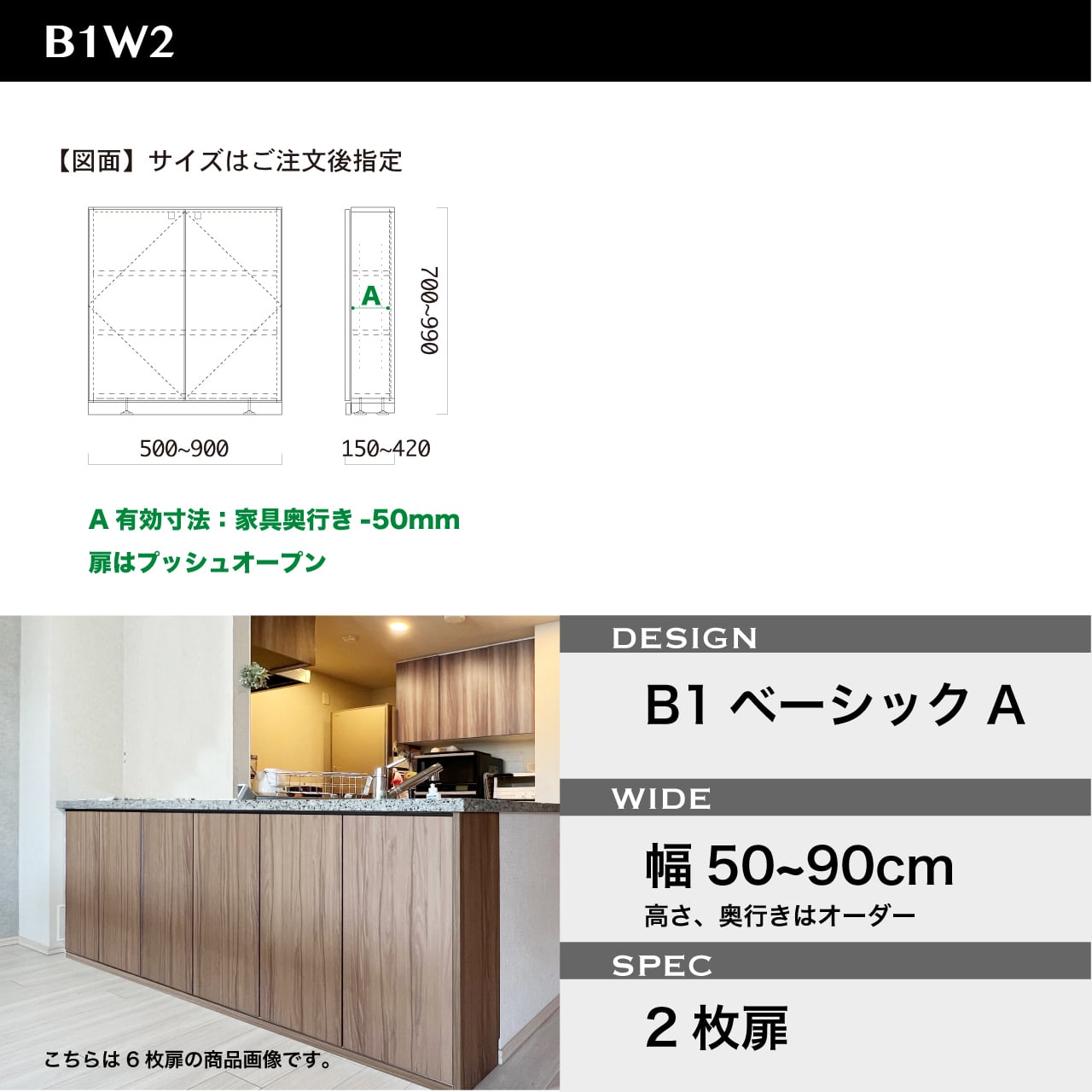 カウンター下収納2枚扉幅50cm~90cm(デザイン:ベーシックA) 奥行き15cm~40cm 高さ70~100cm B1W2