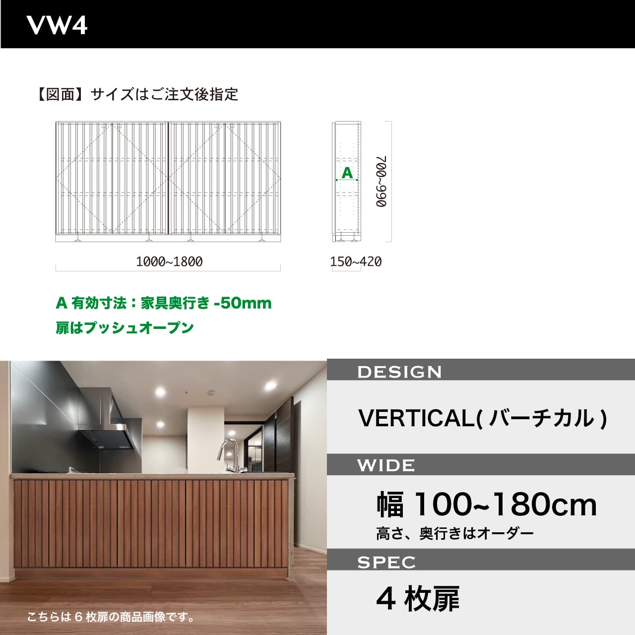 カウンター下収納4枚扉幅100cm~180cm(デザイン:バーチカル) 奥行き15cm~40cm 高さ70~100cm V4